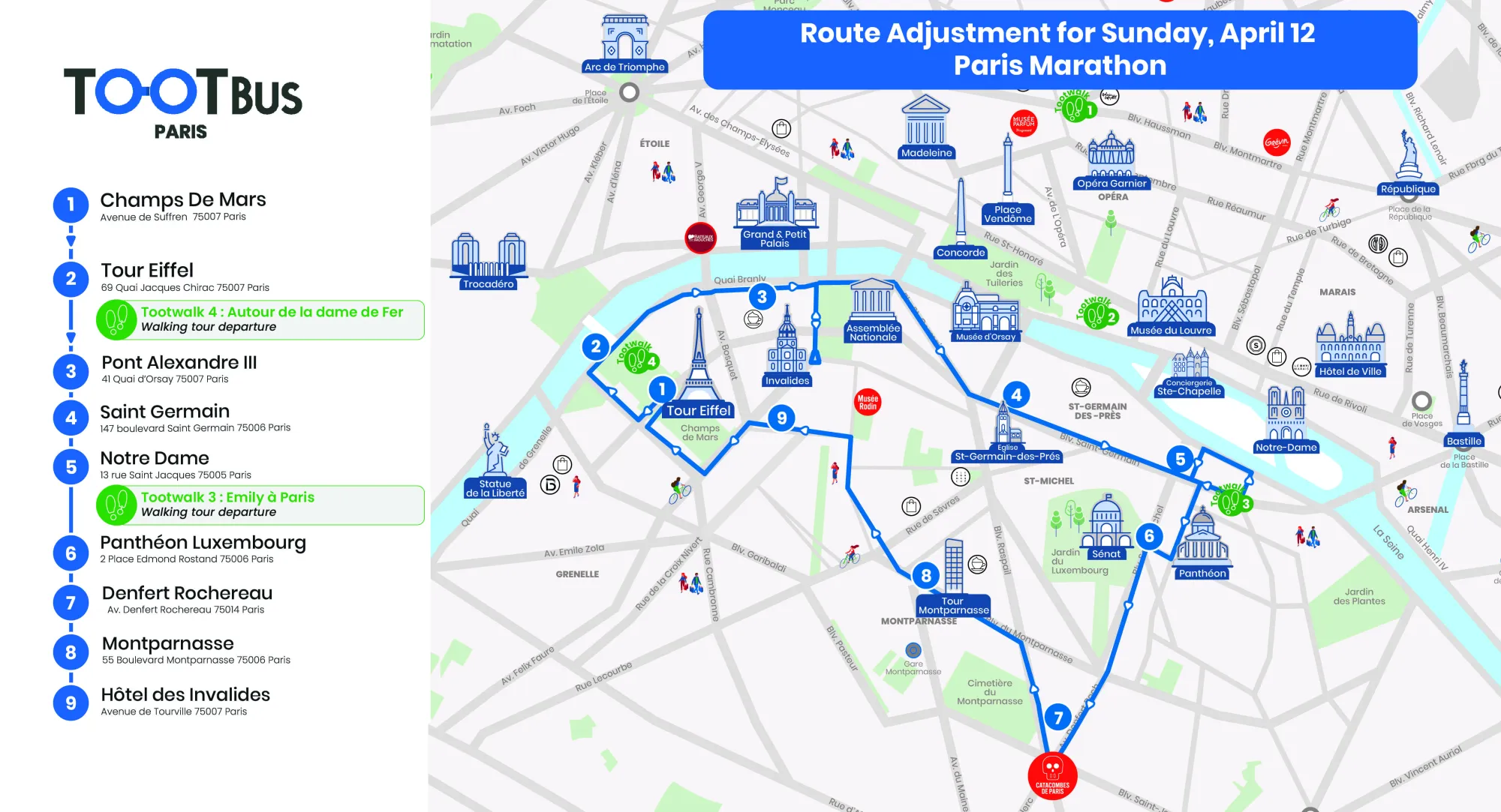 Due to the pedestrianisation of the Champs-Élysées Avenue on the first Sunday of each month, the road is closed to traffic. As a result, our stop n°7 “Arc – Champs-Élysées” is exceptionally relocated to 8 avenue Kléber, 75116 Paris for that day.